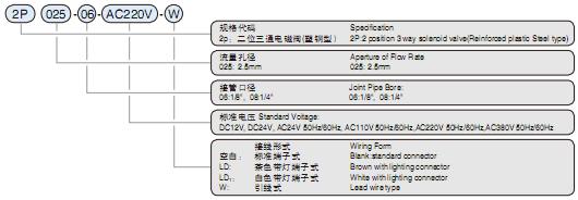2P系列 二位二通电磁阀 产品特点 采用直动式、快速反应,可多用途使用,高效率,长寿命,优良的防水性能。 图形符号:型号注释:技术参数: 型 号:2P025-06 2P025-08